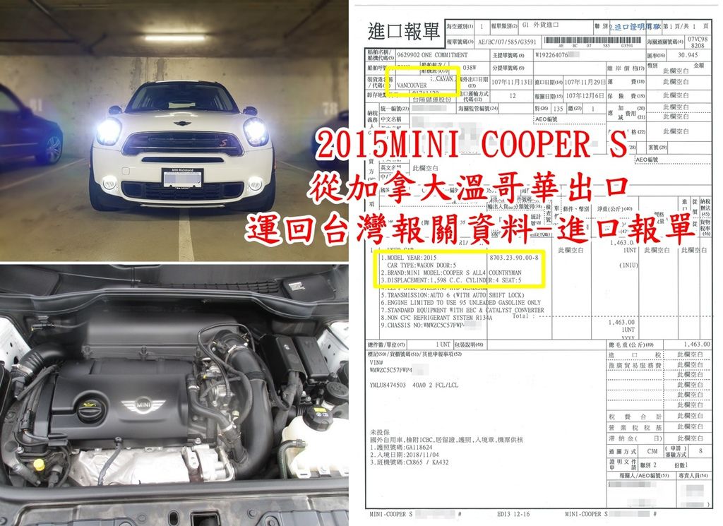 下圖為2015 MINI COOPER S從加拿大運回台灣進口報單,Car2tw協助從加拿大運回台灣及汽車進口報關,