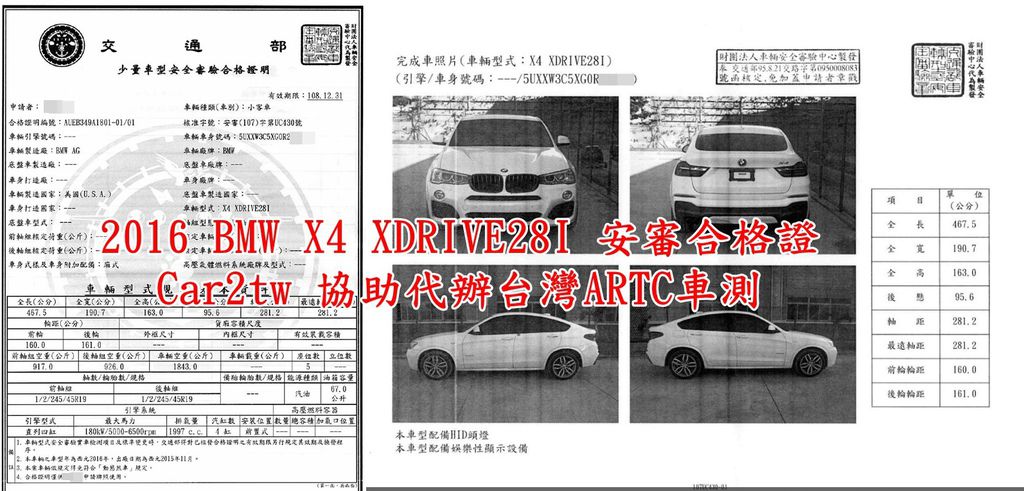 下圖為2016 BMW X4 XDRIVE28I安審合格證,從美國紐約運回台灣的2016 BMW X4 XDRIVE28I這台車是台南王大哥住在美國波士頓買的車,運回台灣是為了給家人來使用,