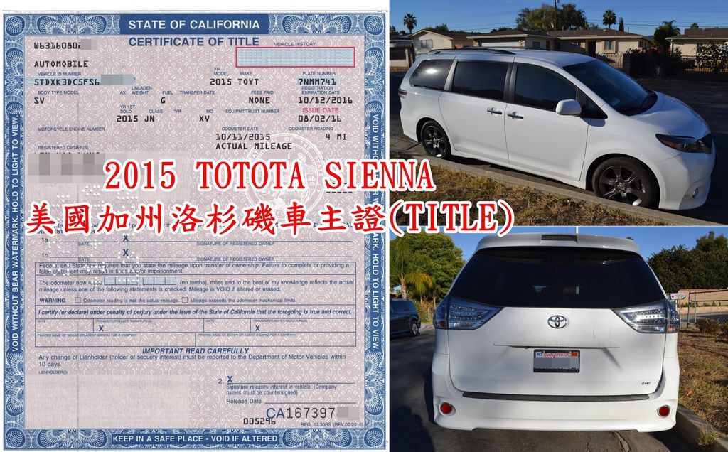 美國各州的TITLE都不太一樣,像下圖為2015 TOTOTA SIENNA 的車主證,留學生華僑自用車從美國帶車回台灣或是想從美國買車運回台灣美國車主證是一定要有的,
