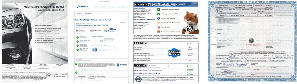 下圖為2018 BENZ GLC300外匯車的CARFAX及AUTOCHECK及車主證( Title)及賓士CPO文件照片(要購買賓士BMW CPO原廠認證車才有),