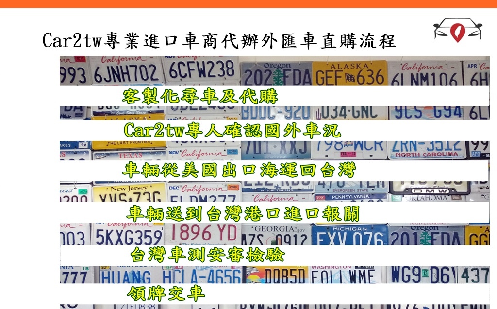 客製化尋車及代購→Car2tw專人確認國外車況 → 車輛從美國出口海運回台灣 → 車輛送到台灣港口進口報關 →台灣車測安審檢驗 → 領牌交車