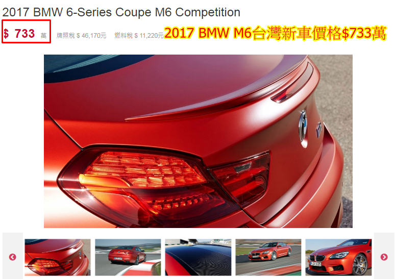 上面有介紹到2017 BMW M6外匯車價格$415萬,這裡看到台灣新車價格需要$733萬,直接省下318萬.