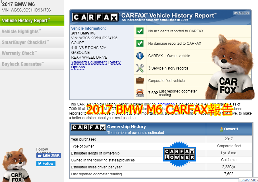 現在來簡單介紹一下CARFAX報告,看CARFAX報告都有介紹什麼內容呢?(如下圖)