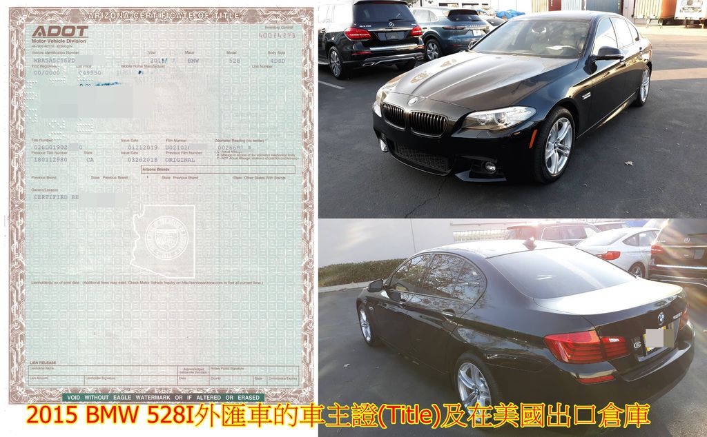 下圖為曾先生委託Car2TW代購2015 BMW 528I外匯車,目前已從美國BMW原廠外匯車車商拖運到美國加州港口出口倉庫.